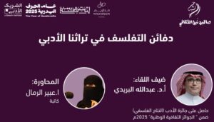 برعاية كريمة من إثنينية الذييب، يُقيم صالون نُبل الثقافي ضمن مبادرة الشريك الأدبي أمسية ثقافية بعنوان: دفائن التفلسف في تراثنا الأدبي، يوم الرابع من ديسمير 2025، الساعة الثامنة مساء في