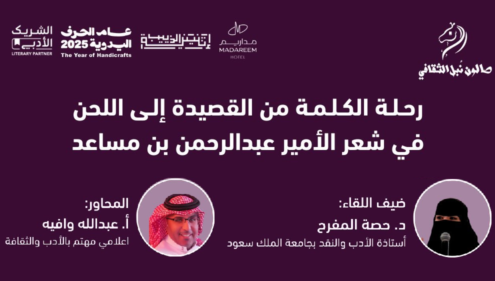 برعاية كريمة من إثنينية الذييب، يُقيم صالون نُبل الثقافي ضمن مبادرة الشريك الأدبي أمسية ثقافية بعنوان: رحلة الكلمة من القصيدة إلى اللحن في شعر الأمير عبدالرحمن بن مساعد، يوم العاشر من ديسمير 2025، الساعة الثامنة مساءً في فندق مداريم. ضيف اللقاء: د. حصة المفرح، أستاذة الأدب والنقد بجامعة الملك سعود، يدير الحوار المحاور الأستاذ: عبدالله وافية.