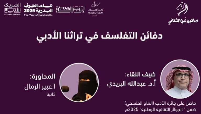 برعاية كريمة من إثنينية الذييب، يُقيم صالون نُبل الثقافي ضمن مبادرة الشريك الأدبي أمسية ثقافية بعنوان: دفائن التفلسف في تراثنا الأدبي، يوم الرابع من ديسمير 2025، الساعة الثامنة مساء في فندق مداريم. ضيف اللقاء: أ.د. عبد الله البريدي، الحاصل على…
